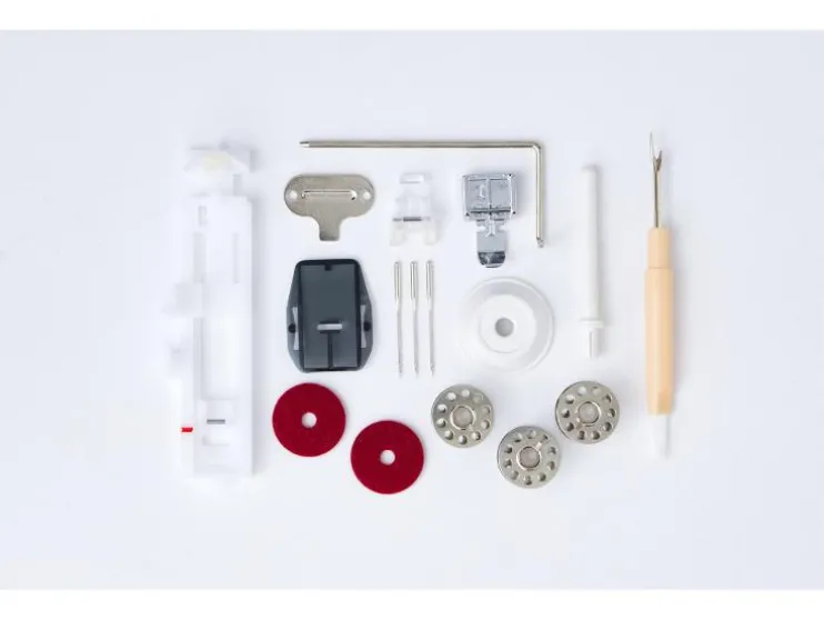 | Leveringsomvang: | 1x computernaaimachine met universele voet ritsvoet knoopsgatvoet, knoopaanzetvoet 4x spoelen (klasse 15 – metaal) 2x vilt, draadspoelkap hulp-spoelpen tornmesje/pluisborstel schroevendraaier kant-/quiltgeleider stopvoet set naalden |