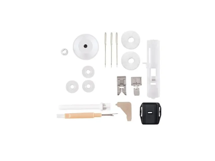 | Leveringsomvang: | 1x naaimachine, 1x naaldassortiment, 3x spoelen, 1x tweede garenkloshouder, 2x onderlegringen, 2x draadafrolschijven (groot + extra groot), 1x tornmesje / borstel, 1x steekplaatsleutel Transportafdekplaat, 1x ritsvoet, 1x standaard naaivoet, 1x knoopsgatvoet, |