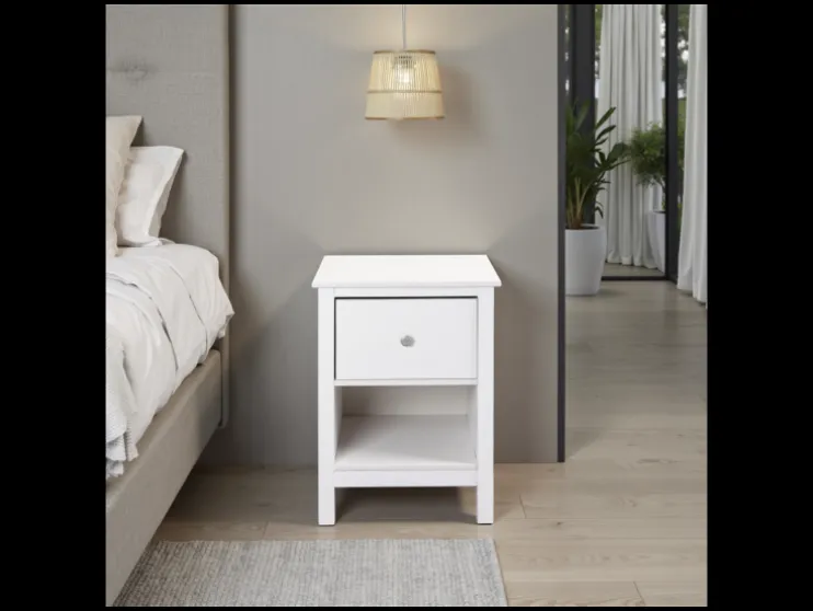 Breng natuurlijke charme en praktische orde in je slaapkamer – met het stijlvolle nachtkastje Ivyna van massief dennenhout. Het wit gelakte oppervlak laat de fijne houtnerf subtiel doorschijnen en geeft het meubelstuk een warme, natuurlijke uitstraling met een moderne touch.