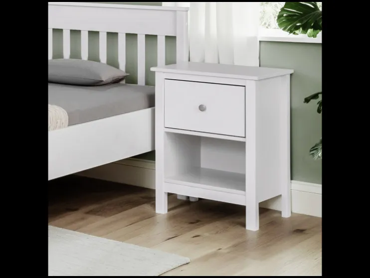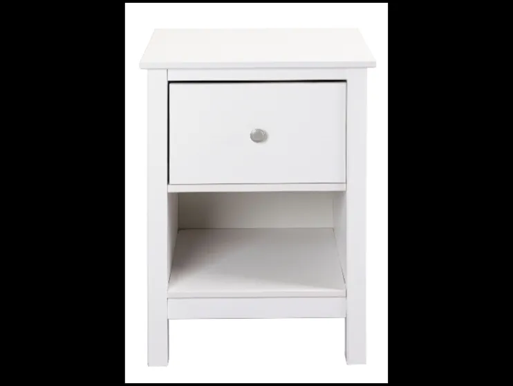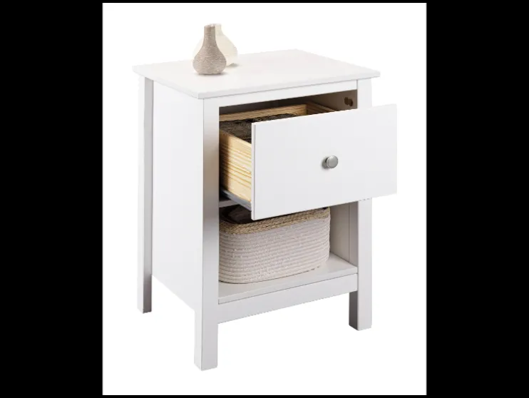 Het Ivyna nachtkastje combineert functionaliteit met eenvoudige elegantie: Een ruime lade met een elegant knopje van zilverkleurig metaal biedt ruimte voor persoonlijke spullen, terwijl de open nis ideaal is voor boeken, manden of decoratie. Het stabiele legvlak is geschikt voor een nachtlampje of een wekker.