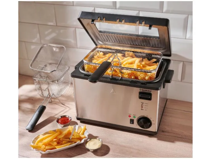 Met deze roestvrijstalen frituurpan bak je makkelijk verschillende snacks en gerechten. De pan wordt geleverd met 3 mandjes, één grote en 2 kleintjes, ideaal voor friet en snacks tegelijk. Je stelt de temperatuur traploos in tot 190 °C en maakt de onderdelen na gebruik weer makkelijk schoon.
