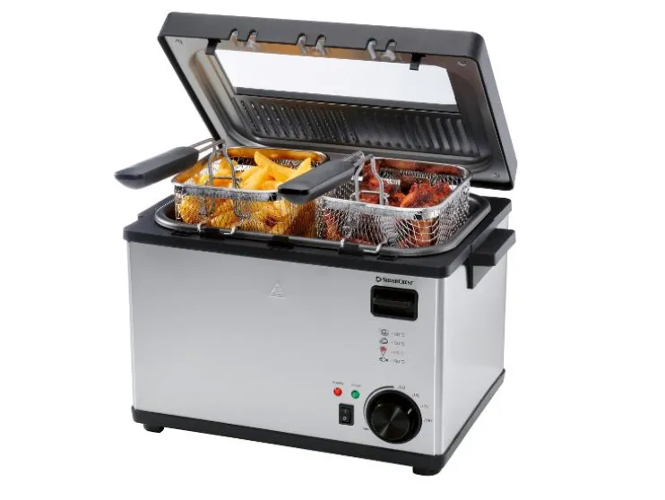- De 2 kleine mandjes zijn handig om tegelijkertijd bijvoorbeeld friet, kippenvleugels en loempia’s te bakken
