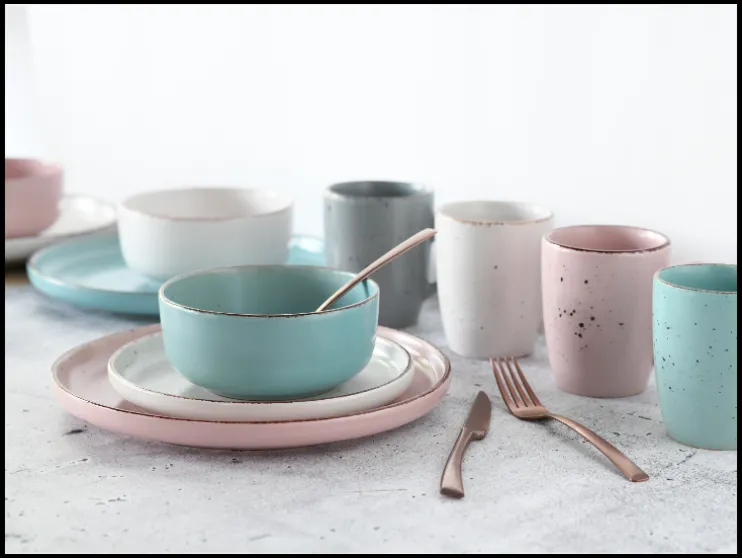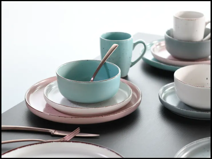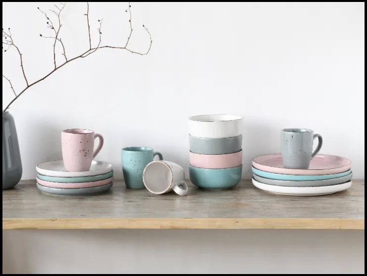 - Zijdematte glazuur met fijne spikkels in tinten als turquoise, mintgroen, steen- en crèmewit