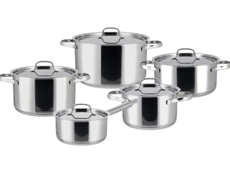 - Set bestaat uit 5 pannen in verschillende formaten: 5,9 l, 3,5 l, 2,9 l, 1,85 l en 1,45 l