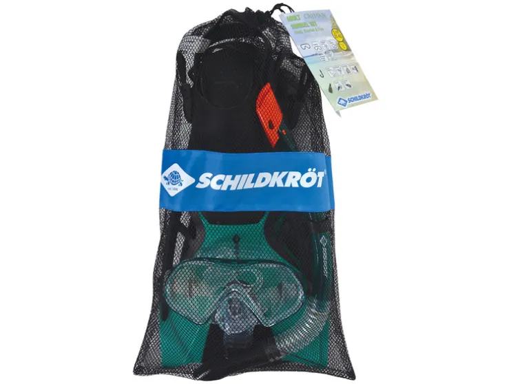 De nieuwe volwassen duikset Cayman van Schildkröt maakt indruk met een geweldige uitrusting van hoge kwaliteit, het beste siliconenmateriaal (vooral voor de snorkel in de mond een MUST!), een trendy design en een sensationele prijs-kwaliteitverhouding! De flexibele snorkel met de beweegbare Easy Clip houder past zich super aan praktisch elke hoofdvorm en verschillende hoofdmaten aan! Aan de bovenkant is hij uitgerust met een opvallende neon-oranje spatbescherming. De bril is gemaakt van doorlopend veiligheidsglas voor het beste zicht. De breedte van de riem kan eenvoudig worden aangepast met twee gespen aan de zijkant. De flippers zijn uitgerust met een 2-componenten flipperblad; deze combinaties maken de flipper flexibeler en comfortabeler om mee te zwemmen. De flippers zijn open aan de achterkant en voorzien van een in breedte verstelbare bevestigingsband. Dit betekent dat de set ook kan worden doorgegeven aan vrienden met een andere schoenmaat. De complete set is verpakt in een praktische hersluitbare nettas. Zo heb je altijd alles praktisch bij de hand. De door het snorkelen natte inhoud kan opdrogen, zand kan eruit sijpelen!