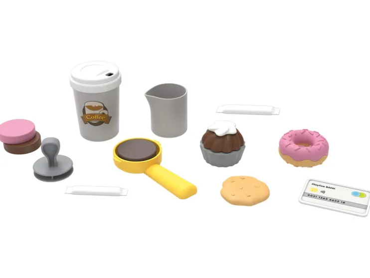 - Accessoires: 2x koffiekopjes met deksel, 1x melkbeker, 1x portafilter, 3x koffiepads, 1x koffiestempel, 2x suikerzakjes, 1x muffin, 1x donut, 1x koekje, 1x creditcard