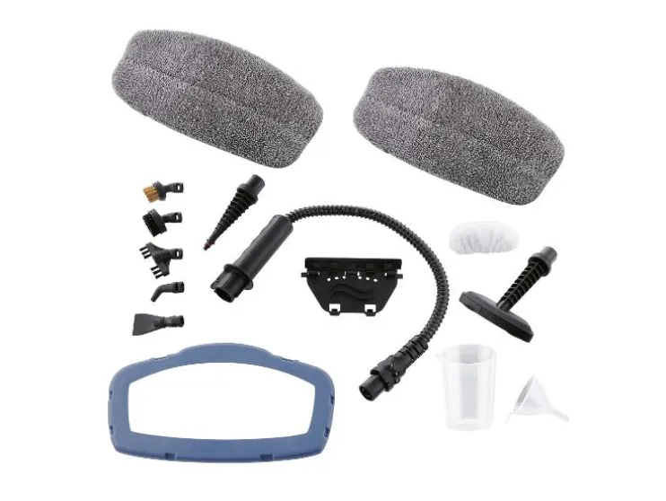 | Leveringsomvang: | 1x stoommop, 1x trechter, 1x maatbeker, 1x dweilhoes (te gebruiken met dweilopzetstuk), 2x dweilhoes voor vloerreiniging, 1x opzetstuk tapijtglijder, 1x opzetstuk ronde borstel groot, 1x opzetstuk ronde borstel klein, 1x opzetstuk borstel langwerpig, 1x opzetstuk hoekmondstuk, 1x opzetstuk schraper, 1x bekledingsbevestiging, 1x dweilopzetstuk, 1x opzetstuk voor verlenging, 1x verlengslang |
