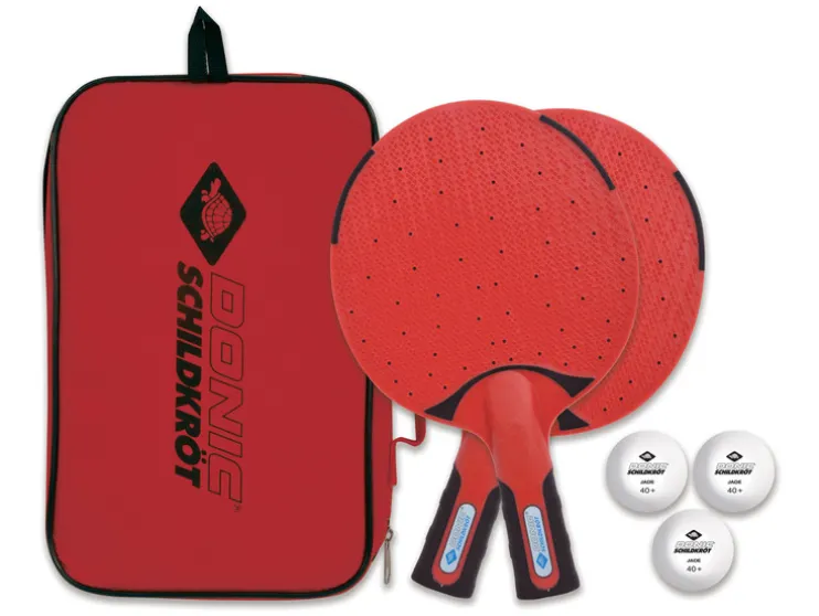 De outdoor weerbestendige set van Donic-Schildkröt bevat 2 st. van de nieuwe innovatieve outdoor-batjes van een 2-componenten kunststof. Een harde torsiebestendige kern van zwart kunststof plus een tweede geïnjecteerd zacht, gripvast (rubberachtig) kunststof in het rood voor grip, stevige grip van het batje, spin, versnelling, etc. Deze nieuwe batjes kunnen elk houten recreatieve batje gemakkelijk bijbenen! Tegelijkertijd zijn ze waterdicht (zodat ze ook in de tuin kunnen blijven liggen als het regent), ze zijn afwasbaar en dus hygiënischer (ideaal voor openbare faciliteiten zoals scholen, jeugdclubs, parochiezalen, etc.).