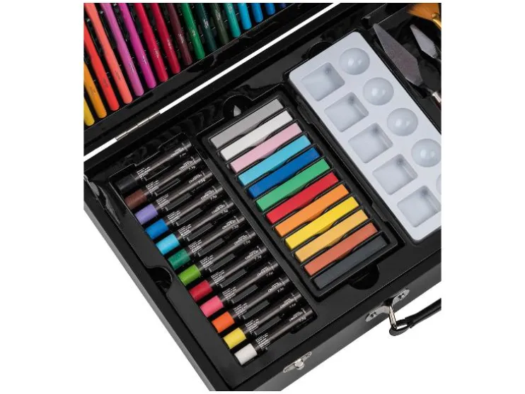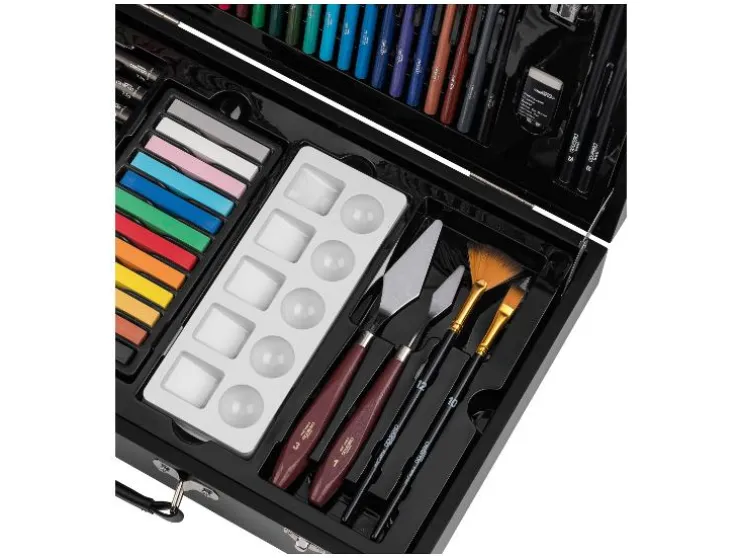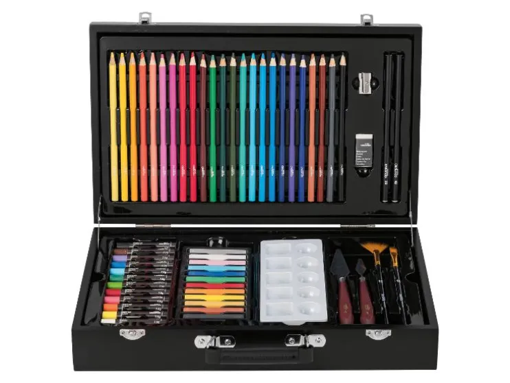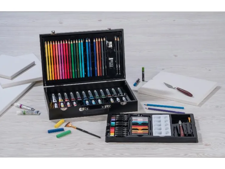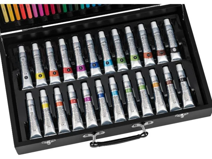 | Materiaal: | Etui: grenen; potloden en kleurpotloden: populier; gum, palet: kunststof; puntenslijper: aluminium; Oliekrijt: paraffine, calciumcarbonaat; pastelstift: paraffine, calciumcarbonaat; Verfschraper: eucalyptus (FSC), staal; penseel: berk, nylon; verftube: aluminium-kunststof |