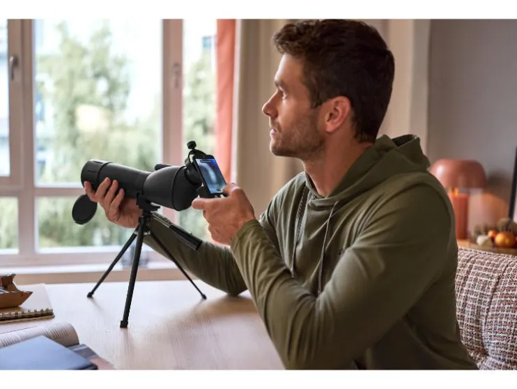 - Voorzien van telefoonhouder op het oculair voor livebeeld, foto’s en video