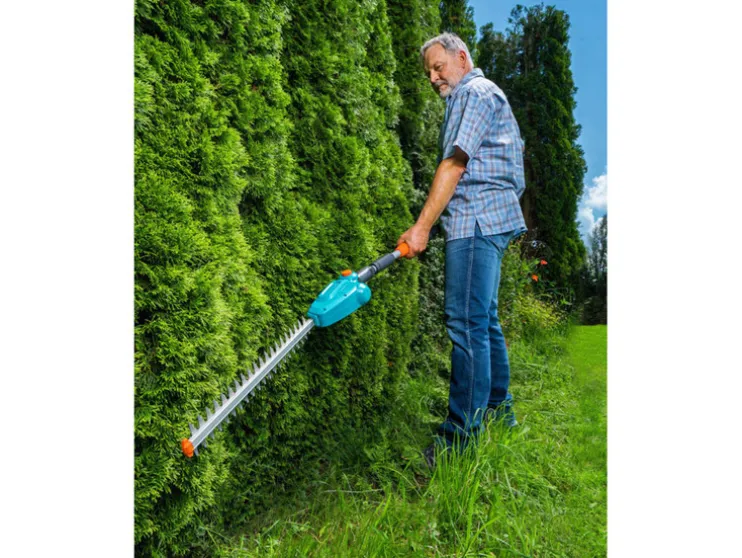 Met de GARDENA accu-telescoop-heggenschaar kunnen zelfs drie meter hoge heggen zonder veel moeite worden geknipt. Want je hoeft niet op een stroomkabel te letten en hebt geen ladder nodig, maar kan steeds met beide voeten op vaste grond staan.