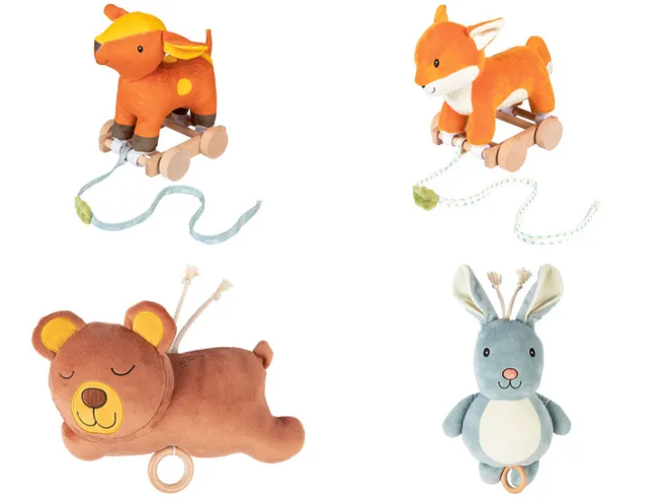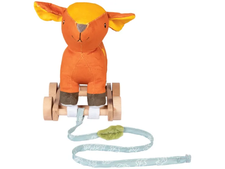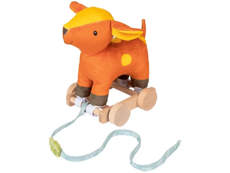 - De lieve knuffel op houten wielen moedigt het leren lopen aan