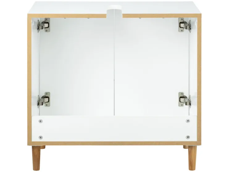 - Wastafelonderkast in wit met natuurlijke accenten dankzij de grepen en meubelvoeten van essenhout