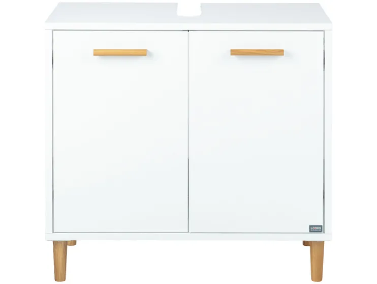 De wastafelonderkast uit de LOOKS by Wolfgang Joop HOME & LIVING COLLECTION presenteert zich klassiek in wit met natuurlijke accenten door de grepen en meubelvoeten van essenhout. Achter de beide deuren met soft-close functie vind je een groot vak waarin alle badkamerbenodigdheden gemakkelijk hun plek vinden. Gemaakt van FSC-gecertificeerd houtmateriaal, waarbij ook rekening is gehouden met duurzaamheidsaspecten.