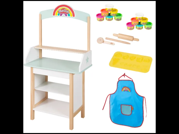 | Leveringsomvang: | Kraam, waterbestendig knutselschort, deegroller, pizzasnijder, modelleerwerktuig van FSC®-gecertificeerd hout, 3D creatieve speel- & knutselmat, 12x Play-Doh klei (2 potjes – ca. 28g in rood, geel, blauw, groen, wit, berry) |